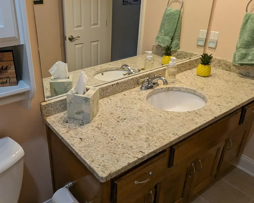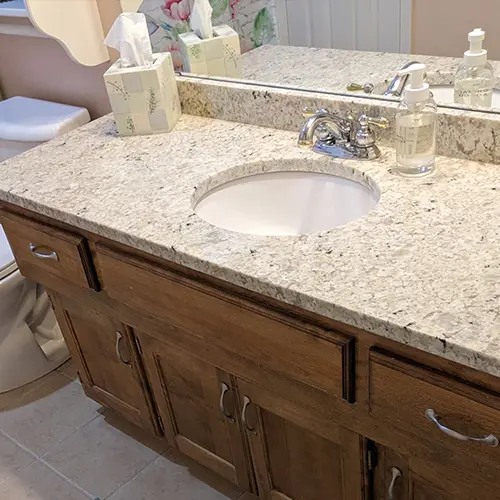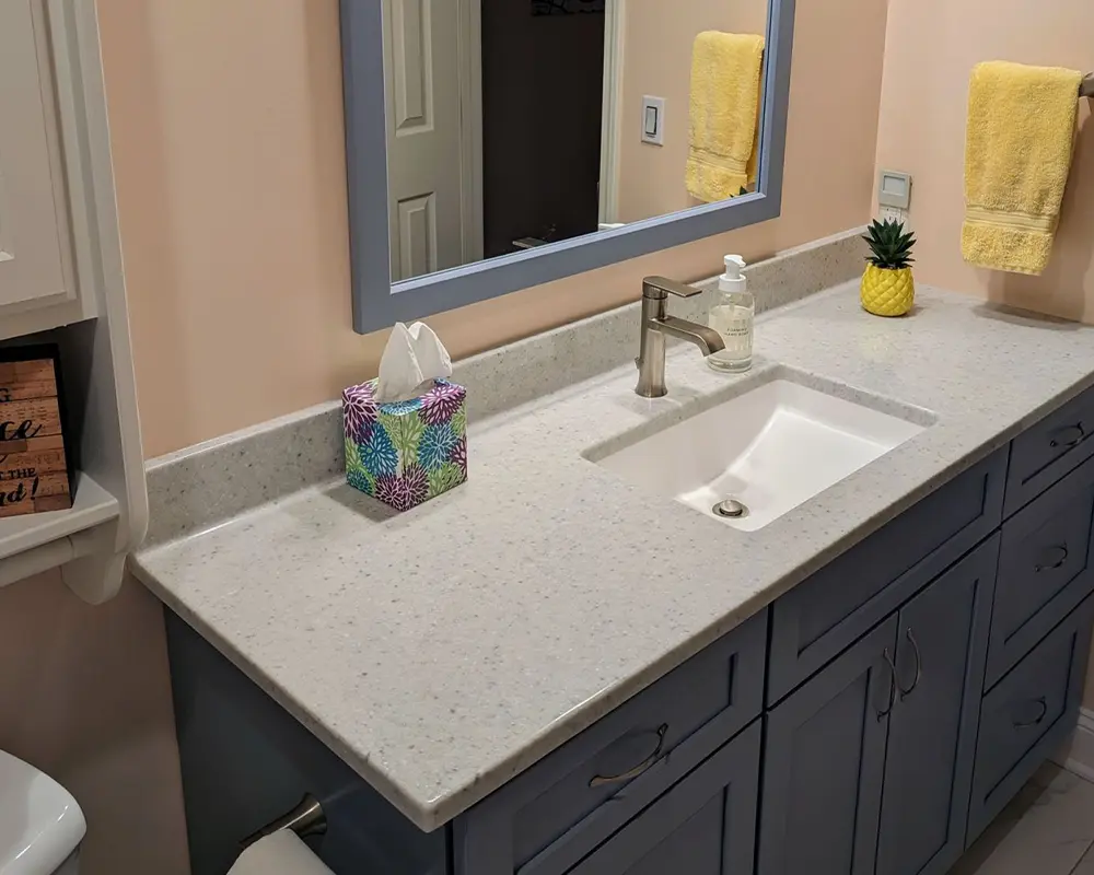 This old, granite countertop was old and dated. Besides, the vanity was not matching the new storage needs anymore,
